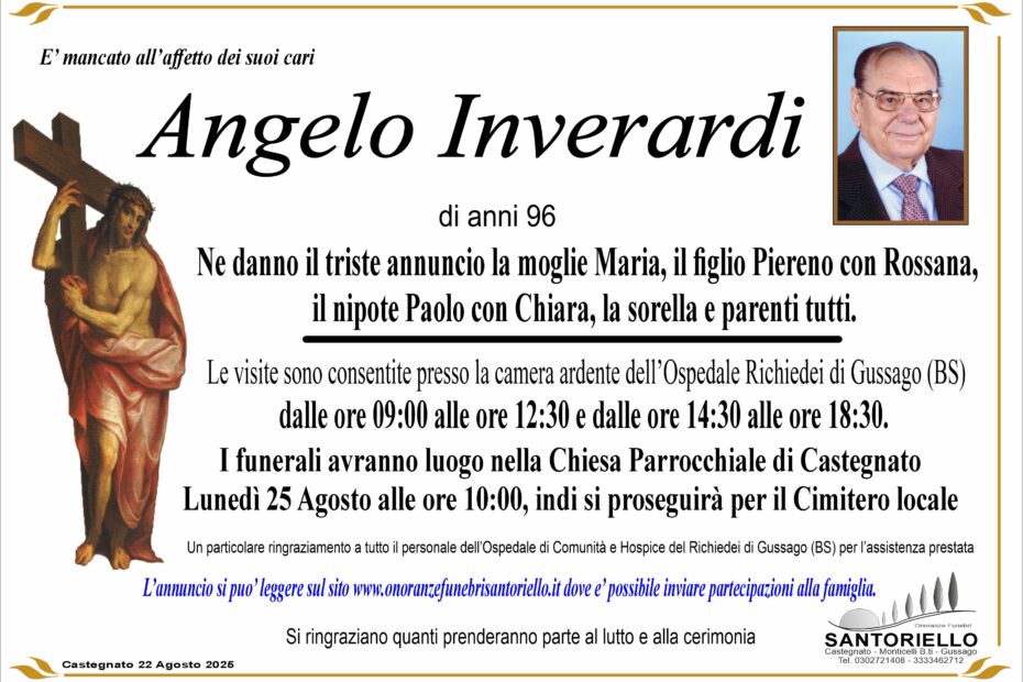 ANGELO INVERARDI22 Agosto 202522 Agosto 20251 commento 1 commento su “ANGELO INVERARDI” Giovanni Inverardi 23 Agosto 2025 a 14:14 Rispondi Sentite condoglianze Giovanni e famiglia Lascia un commento Annulla rispostaIl tuo indirizzo email non sarĂ pubblicato. I campi obbligatori sono contrassegnati *Nome * Email * Sito web Commento * Salva il mio nome, email e sito web in questo browser per la prossima volta che commento.